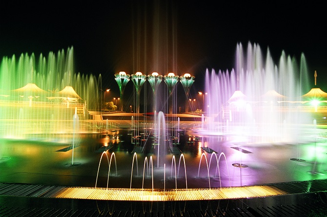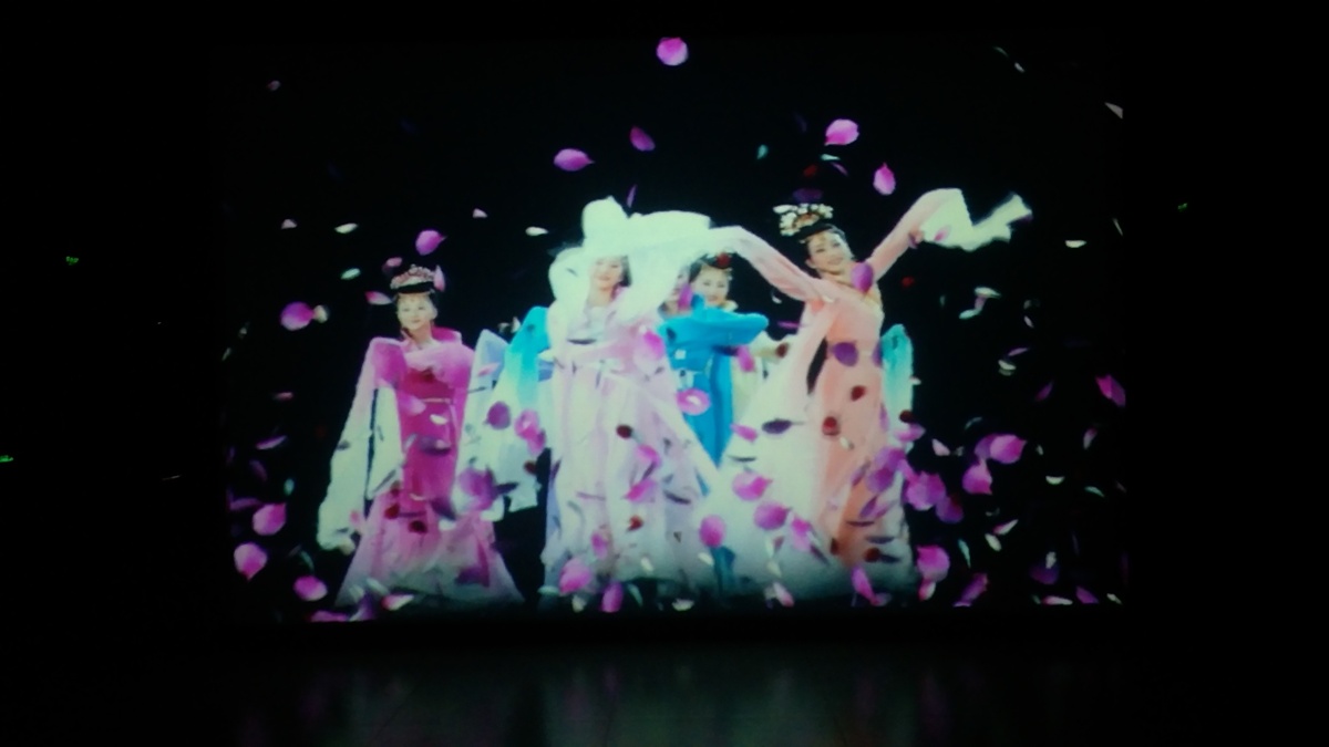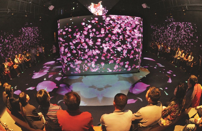 在“多彩城市”展区,有一个巨大的五彩斑斓的包装礼盒。伴随着稚童开心的牙牙学语声,礼品盒的包装缓缓落下时,一个晶莹剔透的水晶瓶呈现在观众眼前。音乐响起,水晶瓶上端如同钻石般璀璨的硕大瓶塞里出现七色彩墨,缓缓流下后幻化成七彩颜色,像水墨画般均匀地铺洒在瓶体表面。瓶体内堆积的七彩颜色幻化为翩翩起舞的仙女,不断地挥洒出漫天的彩色花瓣,逐渐幻化成闪烁的花雨,向四周铺散开来。