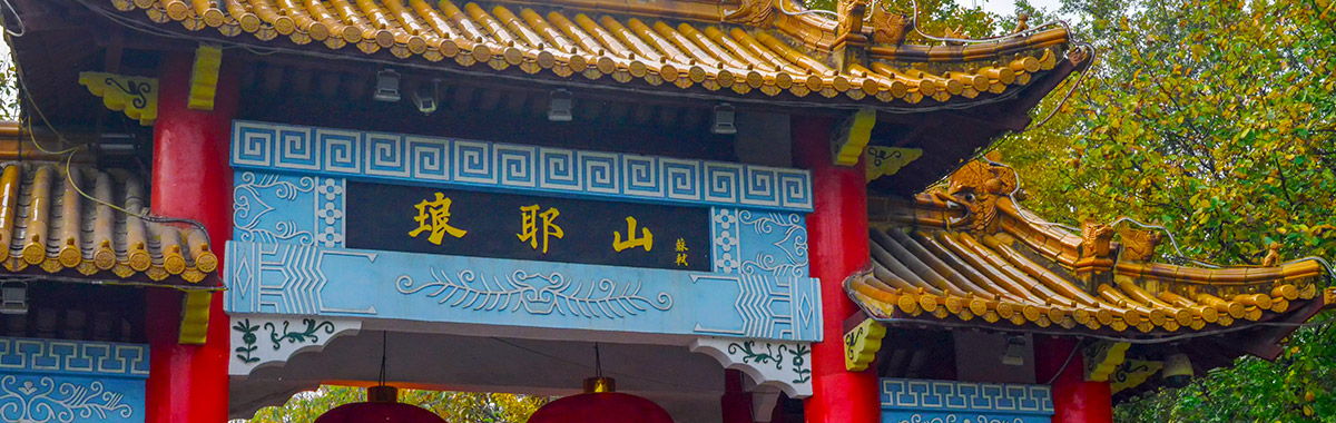 牌楼式的建筑,雄伟壮观,门额上题“琅耶山”三个楷书大字。这三个字是出自北宋文豪、唐宋八大家之一的苏轼之笔,其中“耶”字并非错字,在古代“琊”字有四种不同的写法,三种不同的读音,“耶”字也是其中的一种写法,所以一直沿用至今没有更改。