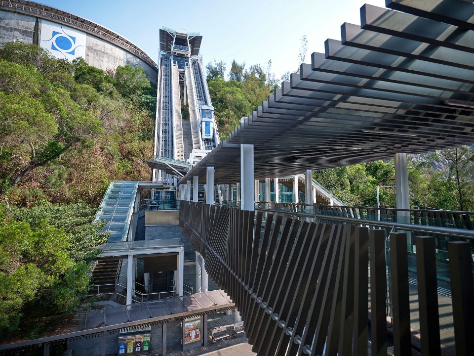 乘依山坡而建的斜行式升降机到氹仔大潭山自来水蓄水池的平台,可眺望到路氹城区的旅游娱乐酒店的建筑群和景色。