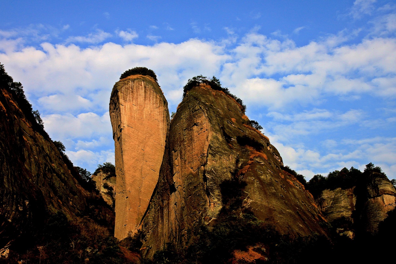 Pepper Peak Scenic Area is a dense area of Langshan Danxia pictographic landscape and an outstanding representative of dense Danxia peak clusters. It perfectly demonstrates the development and evolution mechanism and process of Langshan Danxia, as well as the extraordinary natural beauty of Danxia. Camelback Scenic Spot is an important part of Pepper Peak Scenic Area. The scenic area covers an area of 9.62 square kilometers. The main scenic spots include Pepper Peak, Camel Peak, Linjiazhai, Egongzhai, Candle Peak, Yixiantian, Longkou Chaoyang, etc. Luotuofeng is a pictographic landscape with steep Danxia stone peaks on three sides. The peak is 188 meters high and 273 meters long. Viewed from the north, the camel has a round peak, a bald tail, and a staggered height. The structure is clear and lifelike. Candle Peak next to Camel's Hump is 199 meters high and about 400 meters in circumference. It looks like a red candle. At the foot of the cliff on the east side, there is a huge sloping rock crack, 100 meters long, 50 meters deep, and 0.4-1.8 meters wide. It looks like a giant dragon opening its mouth tilted 60 degrees to the east, shining brightly when the morning sun shines in.