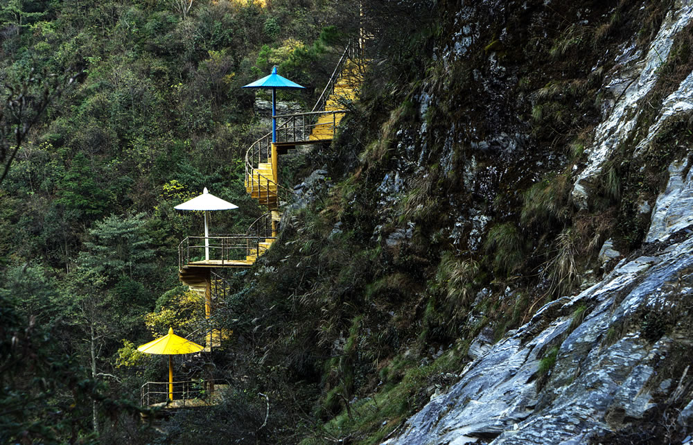 Within the valley, visitors must cross a swaying iron chain bridge, offering a thrilling yet safe experience. Subsequently, they ascend a wooden spiral staircase carved into the cliffside. At the staircase's turning point, there is a small pavilion that, when viewed from afar, resembles several blooming mushrooms on a blue-stone cliff, adding a touch of freshness and beauty amidst the layered mountains.