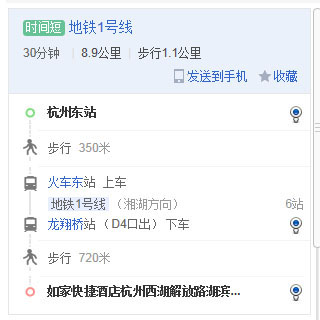 到达杭州东站后,乘地铁1号线(湘湖方向),经过6站,约15分钟,到龙翔桥站下车,走D出口。然后打车或步行720米到达如家酒店解放路湖滨银泰店。