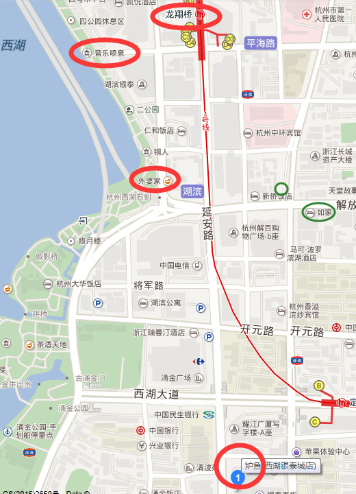 这个位置,可以晚上去欣赏音乐喷泉,去外婆家品尝经济实惠的杭帮菜。