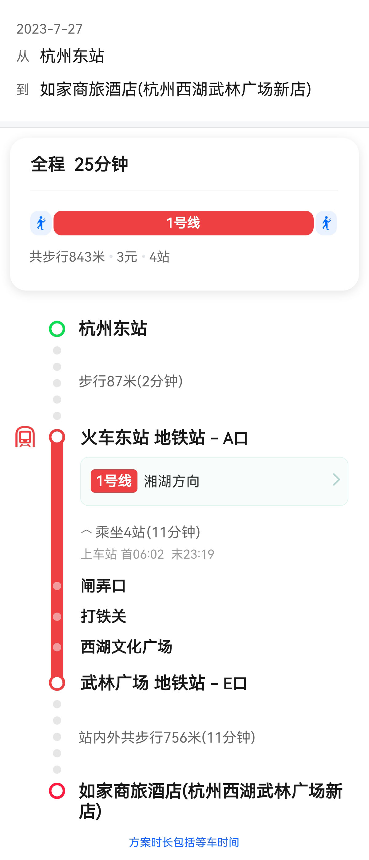 【地铁】乘地铁1号线(湘湖方向)。火车东站→闸弄口→打铁关→西湖文化广场→武林广场,从E出站口步行前往酒店。