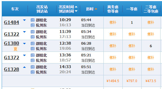 从邵阳北站乘坐高铁,往杭州东站。(单人费用:473.5元)
