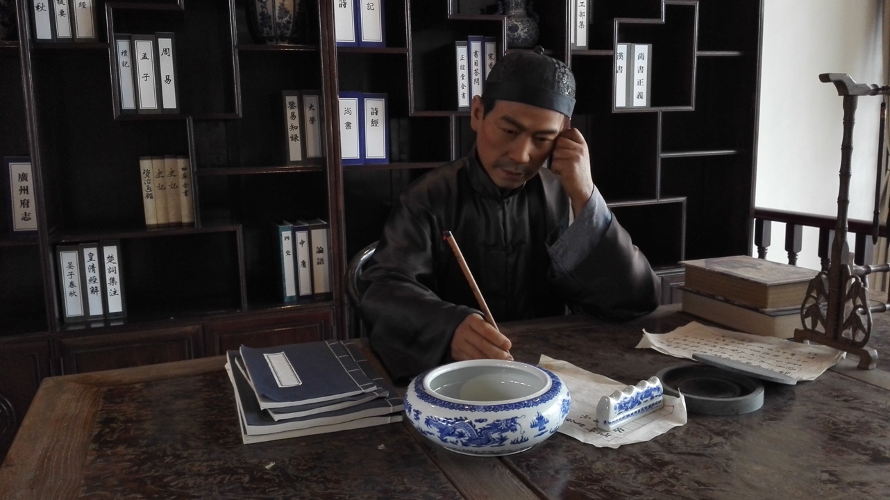 在梁启超纪念馆二楼,栩栩如生的“梁先生”正手握毛笔伏案疾书,不少的游客都误以为是现场“真人秀”,而这仅是高仿的梁启超硅胶像。