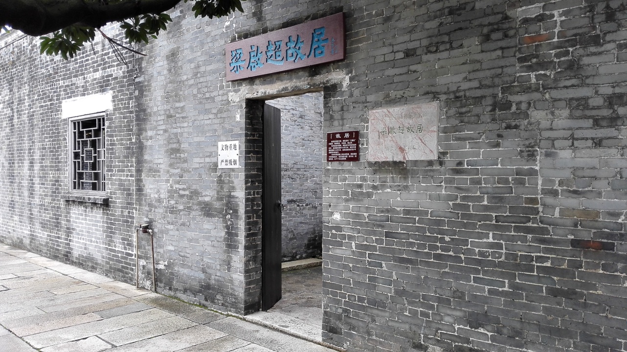 梁启超故居建于清光绪年间,坐落在农舍之间,是一幢古色古香的青砖土瓦平房,占地155平方米,有一正厅、一便厅、一饭厅、二耳房,两厅前各有一天井。便厅侧有梯级直达其顶部楼亭书房,可远眺崖海风光。