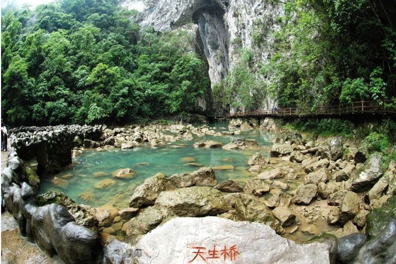 方村河伏流出露不远,有一横跨河两岸的天然巨岩,是喀斯特是貌奇观之一,谷称天生桥,又谓仙人桥。高60米,厚10多米,桥孔宽20多米,河水流过桥后,还形成2米多高的大瀑布。仰观桥孔下,只见巨型钟乳悬挂,桥脚、桥侧的裂隙石缝长出绿石草丛灌木,藤萝花卉缠裹桥身,真是满目琳琅、五颜六色的天然大彩桥。桥下瀑布前水激浪涌,小船不能靠近,到此必须停船,把船扛在肩上攀登危岩,超过瀑布,又才能逆流行舟在暗河峡谷之中。此景惊险,别具一番乐趣。