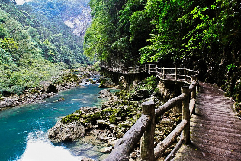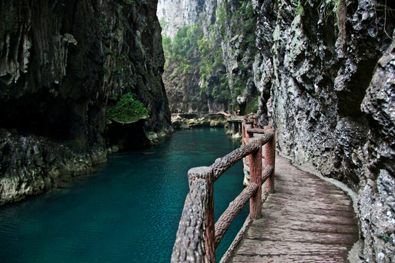 是方村河进入暗河道前的一段明流,是一处宽不过50米,高100多米的深幽河谷。两岸悬崖峭壁上生长各种奇树异草,涨水期河流汹涌澎湃,枯水时节潺潺细流。人沿峡谷行走,往往有惊无险,因为峭壁上可进入暗河的小径旁有密密的小树挡着,行人不用担心会掉下河去,步入此景情趣无穷。