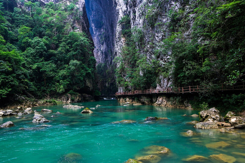 大七孔景区位于荔波县南部,距县城25公里。因王蒙乡孟塘村附近的打狗河(又名孟塘河)上有一座七个孔大桥而得名。此桥高7米、宽4.5米、长35米,横跨东西。