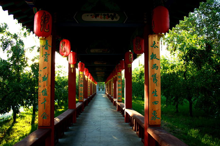 2、趣联廊。在四库流风与阅微草堂之间,有一长廊。长廊两端分别建有四角景亭,在廊(亭)柱或横梁-写(或挂牌)纪晓岚的应对妙联;