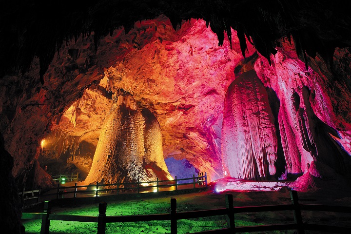 玉皇天宫由巨型石笋、石柱组成的宽敞高大的石厅。集水池、流石坝一体,高出地下河约28米,这里汇聚哪吒出世、玉皇天宫两大世界溶洞自然景观之绝。