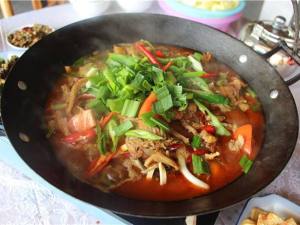 相传明代嘉靖年间,朝廷征调湘鄂西土司兵上前线抗倭,恰好赶上年关,为不误军机,土司王下令提前—天过年,于是腊肉、豆腐、萝卜一锅煮,叫吃“合菜”,以后演变成“三下锅”。如今张家界的三下锅不再是腊肉、豆腐、萝卜一锅煮,多为肥肠、猪肚、牛肚、羊肚、猪