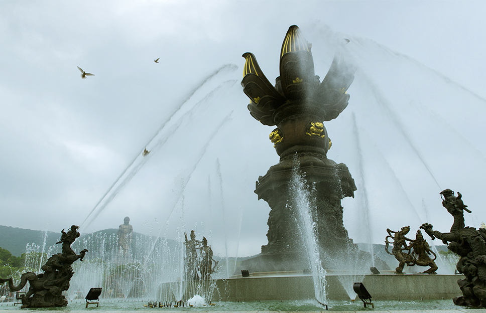 当《佛之诞》音乐奏响时,巨大的六片莲花瓣徐徐绽开,一尊高达7.2米全身鎏金的金身太子佛像,一手指天,一手指地,从莲花中缓缓升起,这时,九龙口中一齐喷射出数十米高的水柱,为太子佛像沐浴。顷刻间,广场四方鼓乐齐鸣,喷泉百态千姿。太子佛像在巨幅水幕中顺时针环绕一周,象征着“花开见佛”、“佛光普照”。随着乐声渐弱,莲花花瓣包裹着太子佛像缓缓合拢。喷泉周围八组凤凰的口中流出的是净水,供游客饮用。依照佛教的说法,此净水是“八功德水”,即佛教“圣水”。