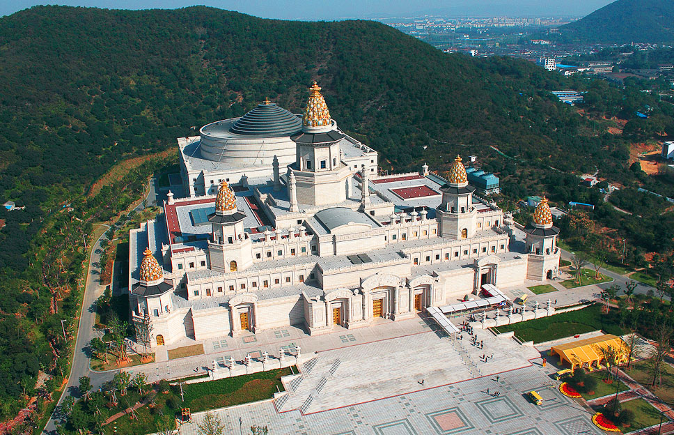 灵山梵宫是集旅游、会议、展览和文化体验多功能于一体的文化建筑,整个建筑依山而建,糅合了中国佛教石窟艺术及传统佛教建筑元素,建筑面宽150米,进深180米,总面积达5万平方米。主体建筑分为南区和北区两部分,其外部的5座塔顶按敦煌壁画中的“华塔”为原型设计装饰:内部又高大的廊柱、大跨度的梁柱、高耸的穹顶、超大面积的厅堂,各空间独立且互相贯通,由门厅、廊厅、塔厅、圣坛、三传会议厅(汉传会议厅、藏传会议厅、南传会议厅)、千人宴会厅等组成。梵宫圣坛是第二届世界佛教论坛的主会场,它具有会议和演出等多种功能,可以举行容纳2000人的大型国际会议。梵宫圣坛每天定时举行的《灵山吉祥颂》表演,采用了先进的多媒体技术,给观众带来全新的视觉盛宴。梵宫与五印坛城、曼飞龙塔一起,代表了佛教三大语系。