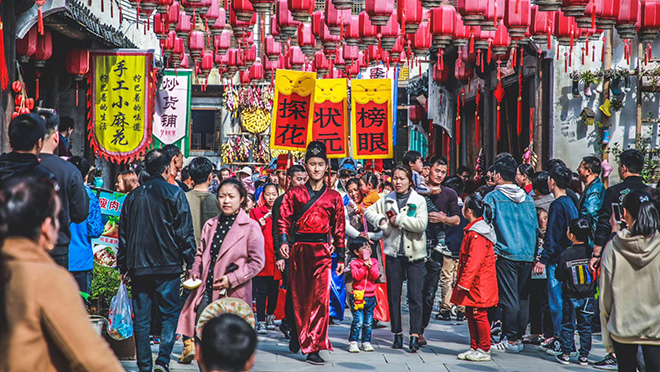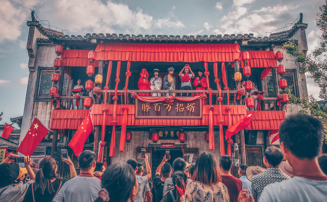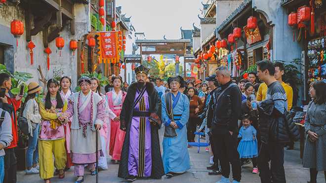 【梦里老家】演艺小镇挖掘徽州文化精髓,传承婺源民俗记忆,以市井街巷为载体,以演艺为灵魂,为游客提供穿越千年的新奇体验,游客可以亲临现场感受人生三大幸事——衣锦还乡、金榜题名、洞房花烛,领略古徽州繁华什锦、车水马龙的市井风情。