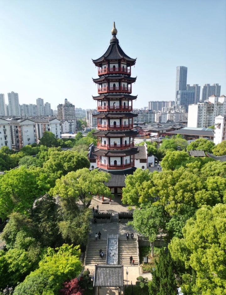 绳金塔葫芦铜顶金光透亮,通身朱栏青瓦,墨角净墙,古朴无华。绳金塔为江南典型的砖木结构楼阁式塔,塔高50.86米,塔身七层八面(明七暗八层),青砖砌筑,平面为内正外八边形。塔身每层均设有四面真门洞、四面假门洞,各层真假门洞上下相互错开,门洞的形式各层也不尽相同。第一层为月亮门;第二、三层为如意门;第四至七层为火焰门,三种拱门形式集于一塔,这种做法是不多见的。