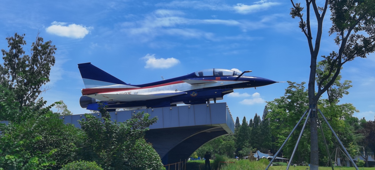 在公园里“铁翼风华”的飞机跑道造型的展示平台,长62米、宽37米、高6米,展示着中国空军八一飞行表演队的歼-10表演机。跑道下方有四幅展示中国航空发展大事件的彩绘画。