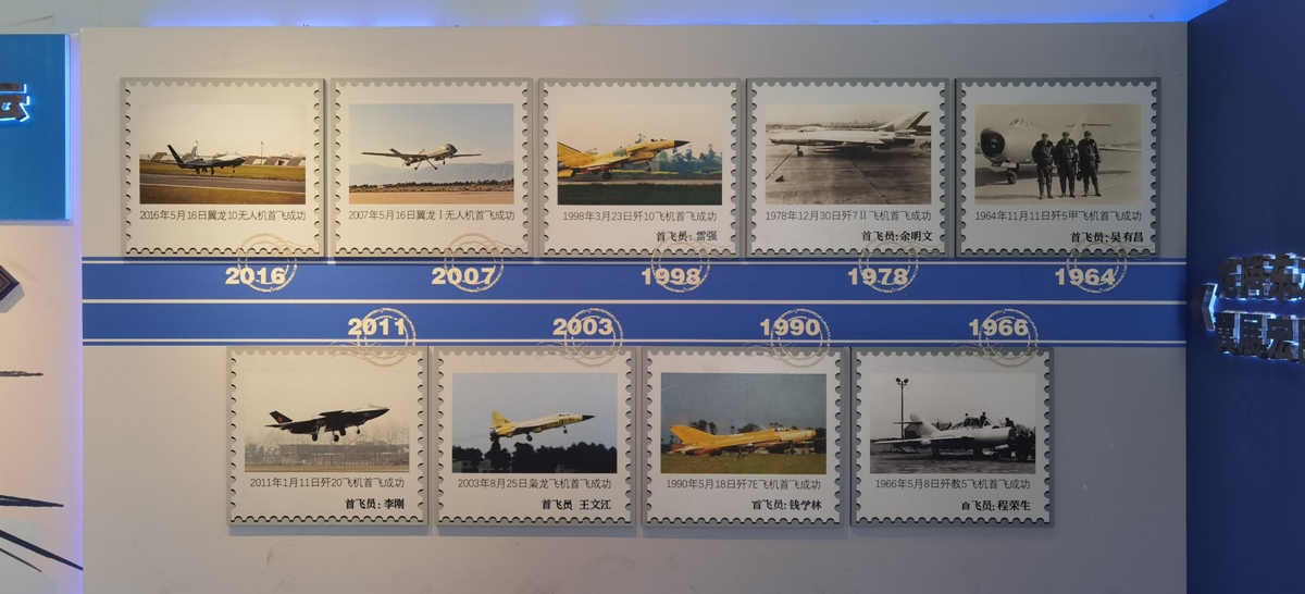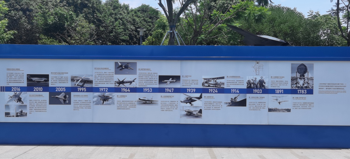 在威龙广场北面的是蓝白相间的航史知识墙,脚下的52块铜板记录着中国航空发展史大事记。从热气球到无人太空飞机,记录着追梦过程中的点点滴滴。