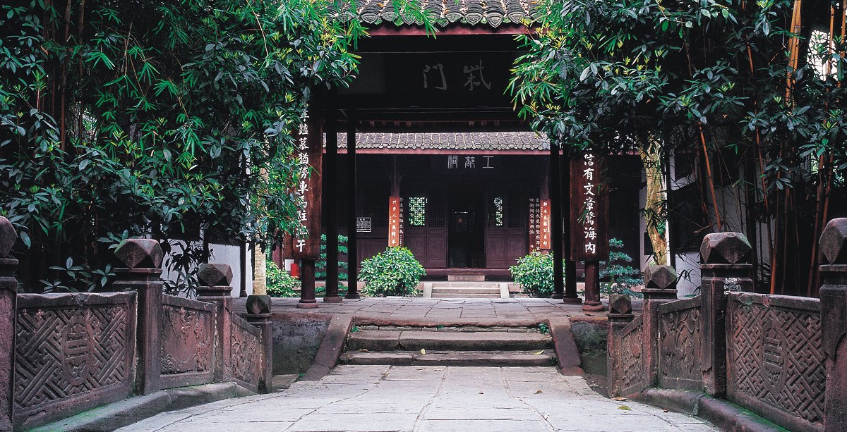 柴门是中轴线上的第四重建筑,也是最小、最简朴的建筑。它原本是杜甫营建草堂时所造的院门。因为低矮简陋,诗人作了如此命名。门上匾额“柴门”二字是著名画家潘天寿所书。
