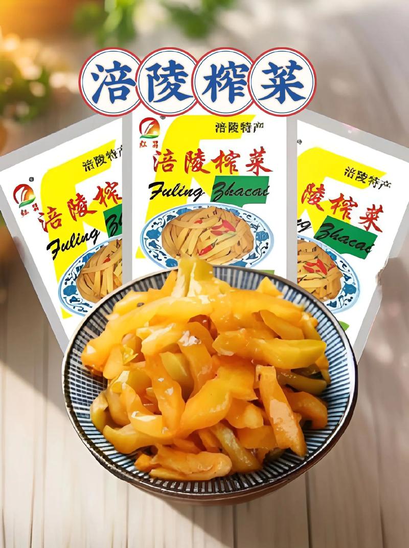 涪陵榨菜选用涪陵特有的青菜头,经独特的加工工艺制成的鲜嫩香脆的风味产品。与法国酸黄瓜、德国甜酸甘蓝并称世界三大名腌菜,也是中国对外出口的三大名菜(榨菜、薇菜、竹笋)之一。其传统制作技艺被列入第二批国家级非物质文化遗产名录。