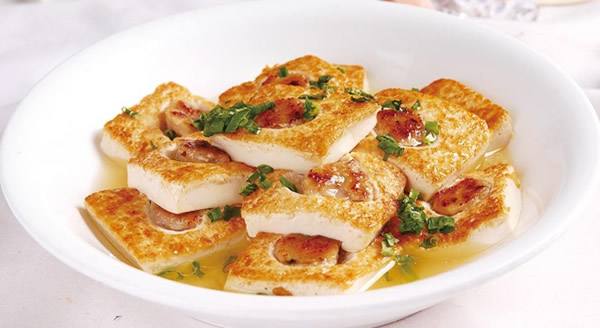 客家的常见小吃,制作时,把豆腐斜切成约一寸见方的三角块或四方形,投入油锅中炸一会,取出沥干,再切开,在里面放入调有糯米、大蒜、五香、辣椒粉等拌成的半熟佐料,吃时再撒上些胡椒面、葱花,味道尤为鲜美。