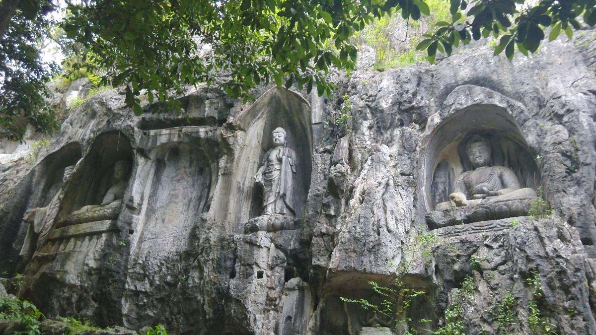 作为禅宗五山之首,飞来峰石刻造像是中国南方石窟艺术的重要作品,这些雕琢于石灰岩上的佛像时代跨度从五代十国至明,在470多尊造像中,保存完整和比较完整的有335尊,妙相庄严,弥足珍贵。其中年代最早的是青林洞入口靠右的岩石上的弥陀、观音、大势至等三尊佛像,为951年(北汉乾祐四年)所造。而卢舍那佛会浮雕造像则是北宋造像艺术精品。最为人所知的,莫过于大肚弥勒和18罗汉群像,此为飞来峰摩崖石刻中最大的造像,也是国内最早的大肚弥勒造像。佛像雕刻生动传神,坐于佛龛中的大肚弥勒坦跣足屈膝,手持数珠,袒胸鼓腹而开怀大笑,将“容天下难容事,笑天下可笑之人”的形象刻画得淋漓尽致。周围并环十八罗汉,也是神情各异,细致生动。元代的100余尊汉、藏风格的石刻亦容相清秀,体态窈窕,为佛教艺术之鸿宝。