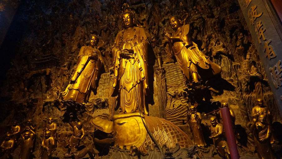 灵隐寺的原释迦牟尼佛像,于1949年大雄宝殿正梁因白蚁蛀空倒塌时被毁这座佛像是在1953年重修寺宇时,由中国浙江美术学院的雕塑家和民间艺人们采用唐代禅宗佛像为蓝本共同精心设计的。佛像高19.6米,比原先的释迦造像高一倍多,用近百块香樟木雕成。佛像造型端庄凝重,气宇轩昂,低眉细目。